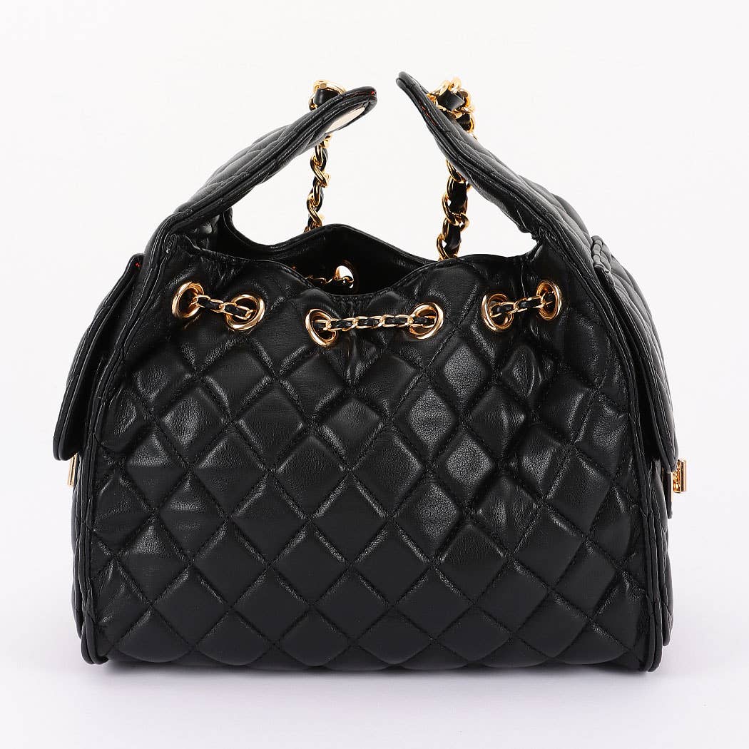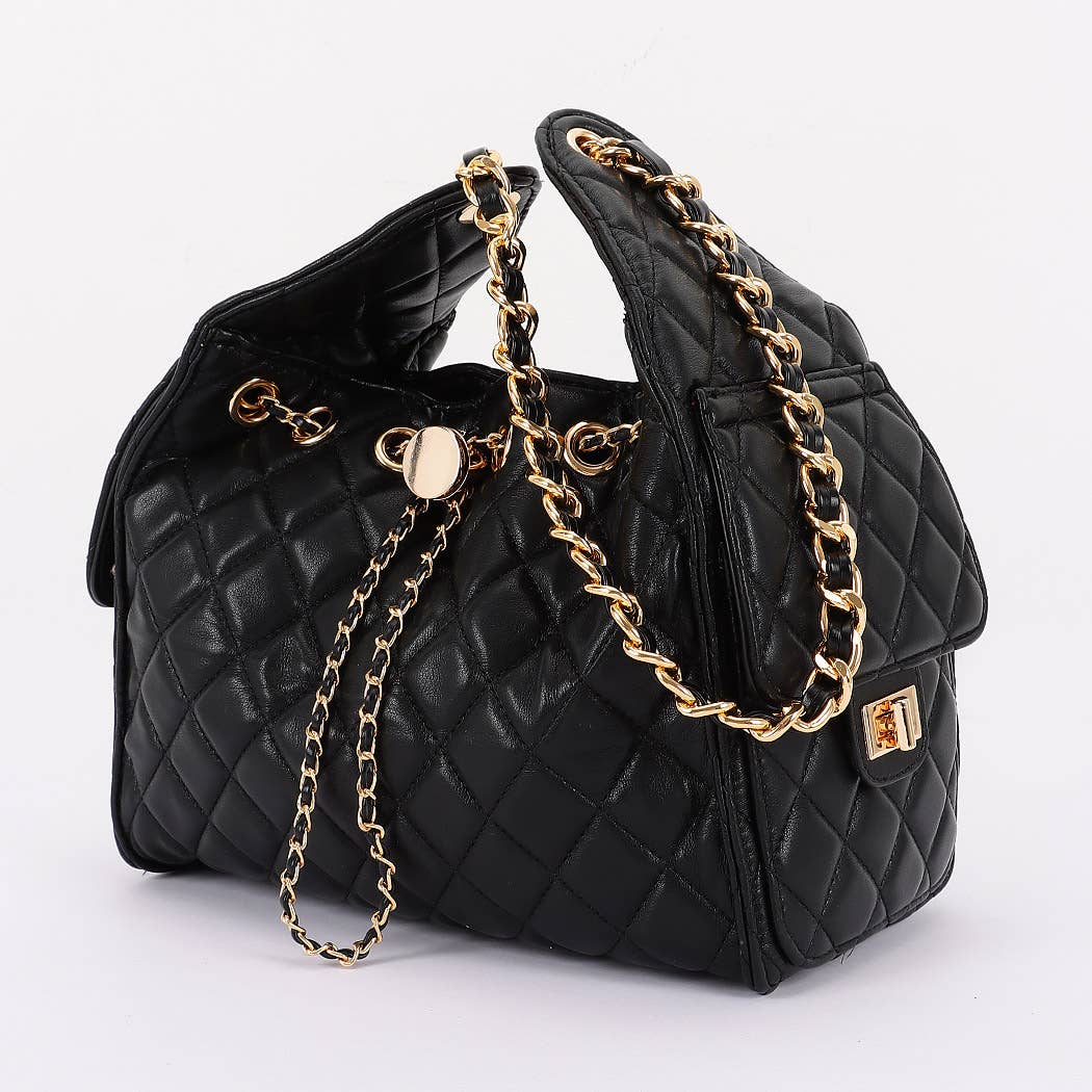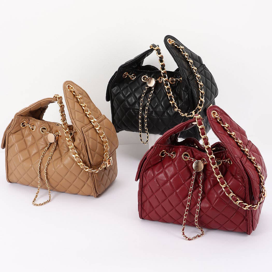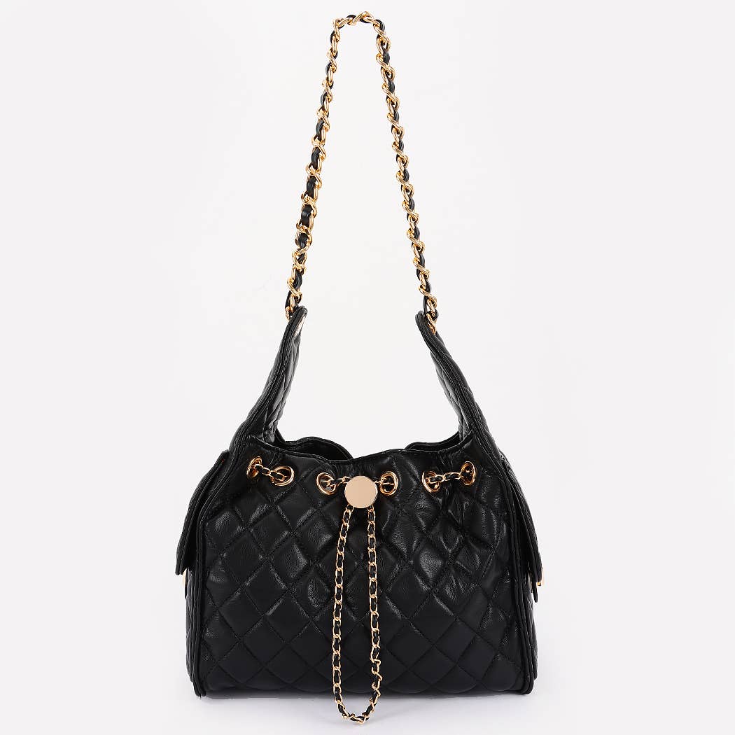 * This is a stylish handbag with a quilted pattern. It has a chain strap and decorative chain details. The bag features a drawstring - like design with a circular adornment at the front. From H&D Accessories, it combines elegant elements for a fashionable look.