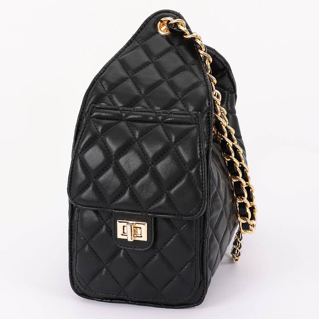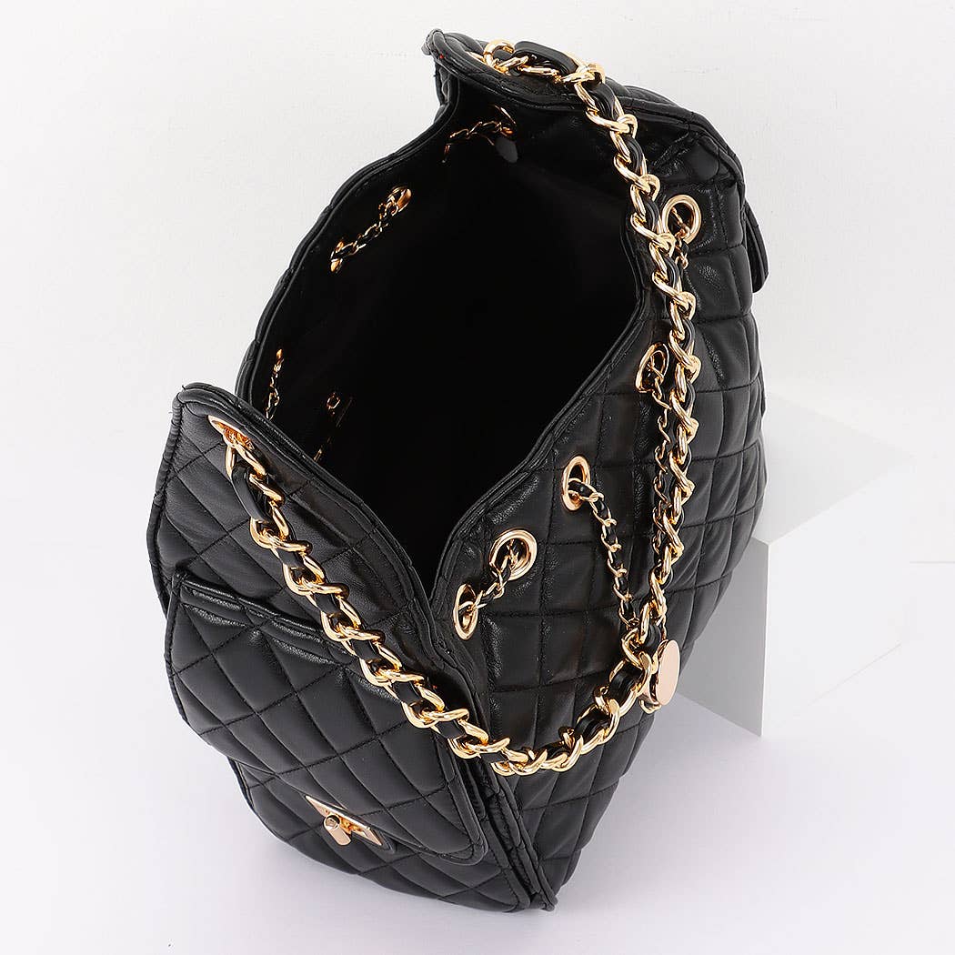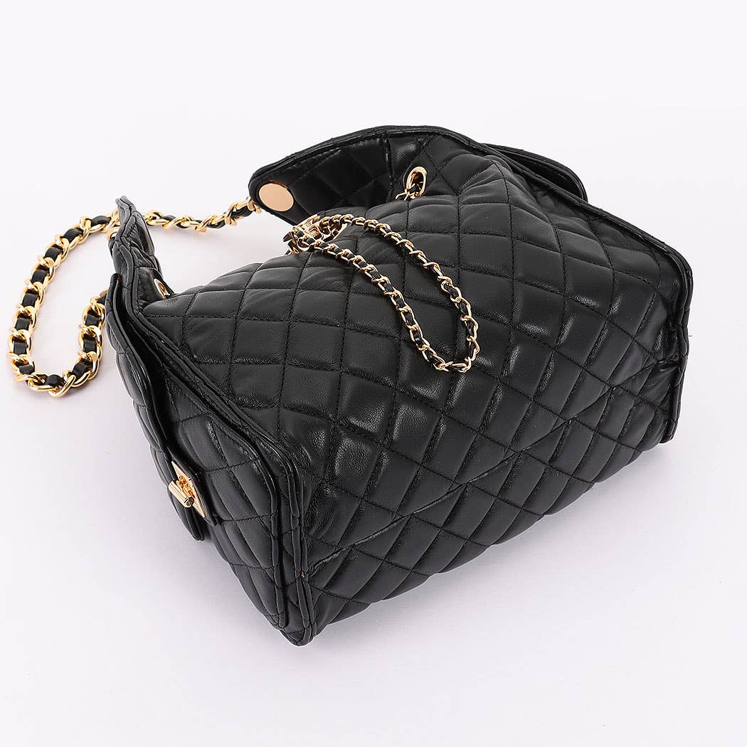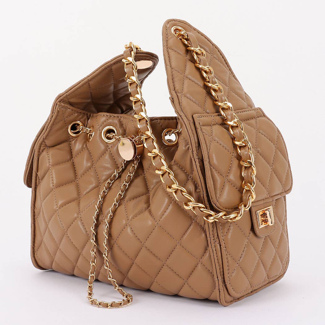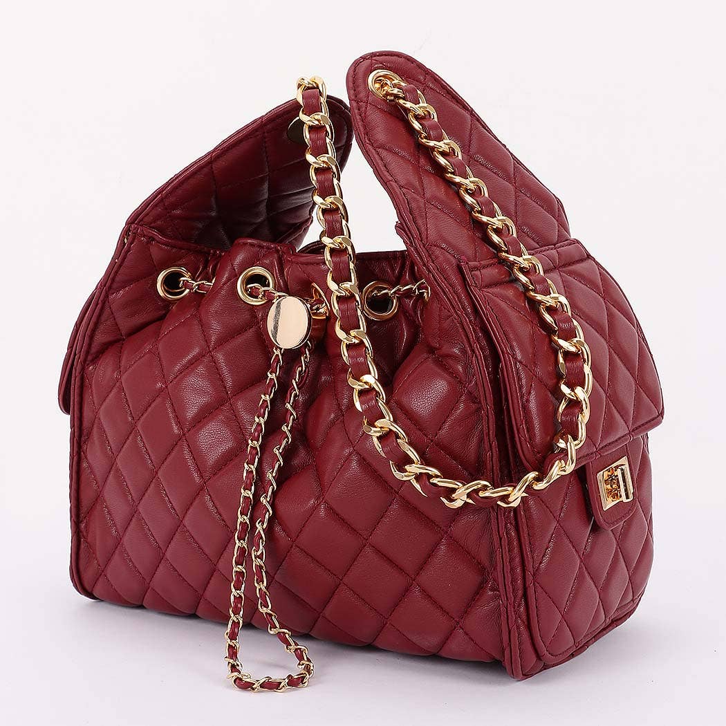 * This is a stylish handbag with a quilted pattern. It has a chain strap and decorative chain details. The bag features a drawstring - like design with a circular adornment at the front. From H&D Accessories, it combines elegant elements for a fashionable look.