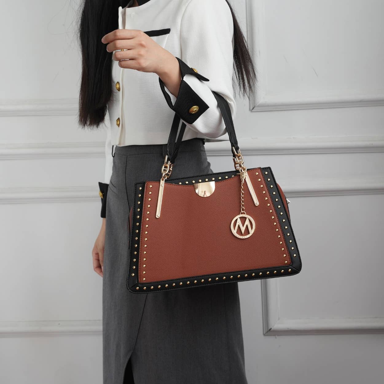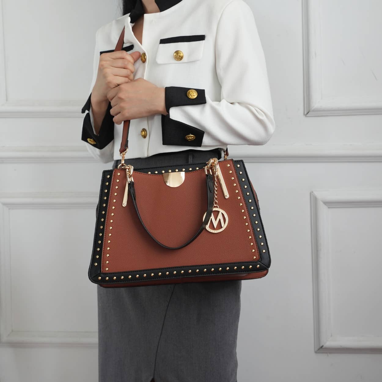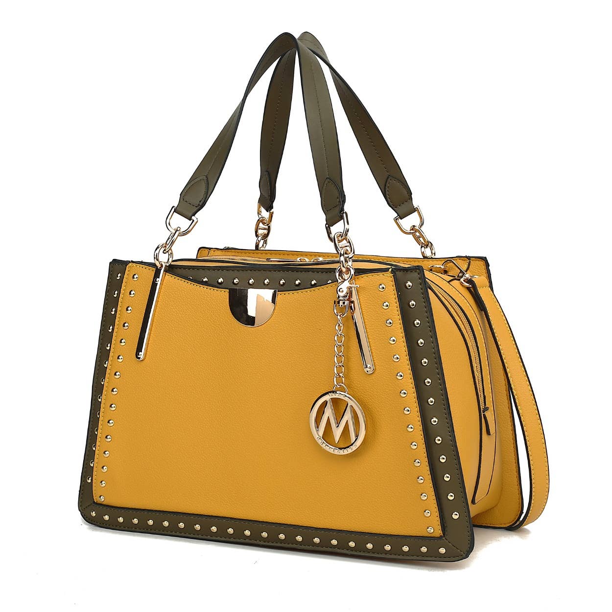 Introducing the Mia K Aubrey Satchel: Crafted from high-quality vegan leather with luxurious gold tone embellishments. This chic handbag features a spacious three-compartment design, convenient top zipper closure, and multiple pockets for organization. With its versatile crossbody strap and timeless design, it's the perfect blend of style and functionality. Choose from a range of vibrant colors and make a statement while supporting sustainable fashion.